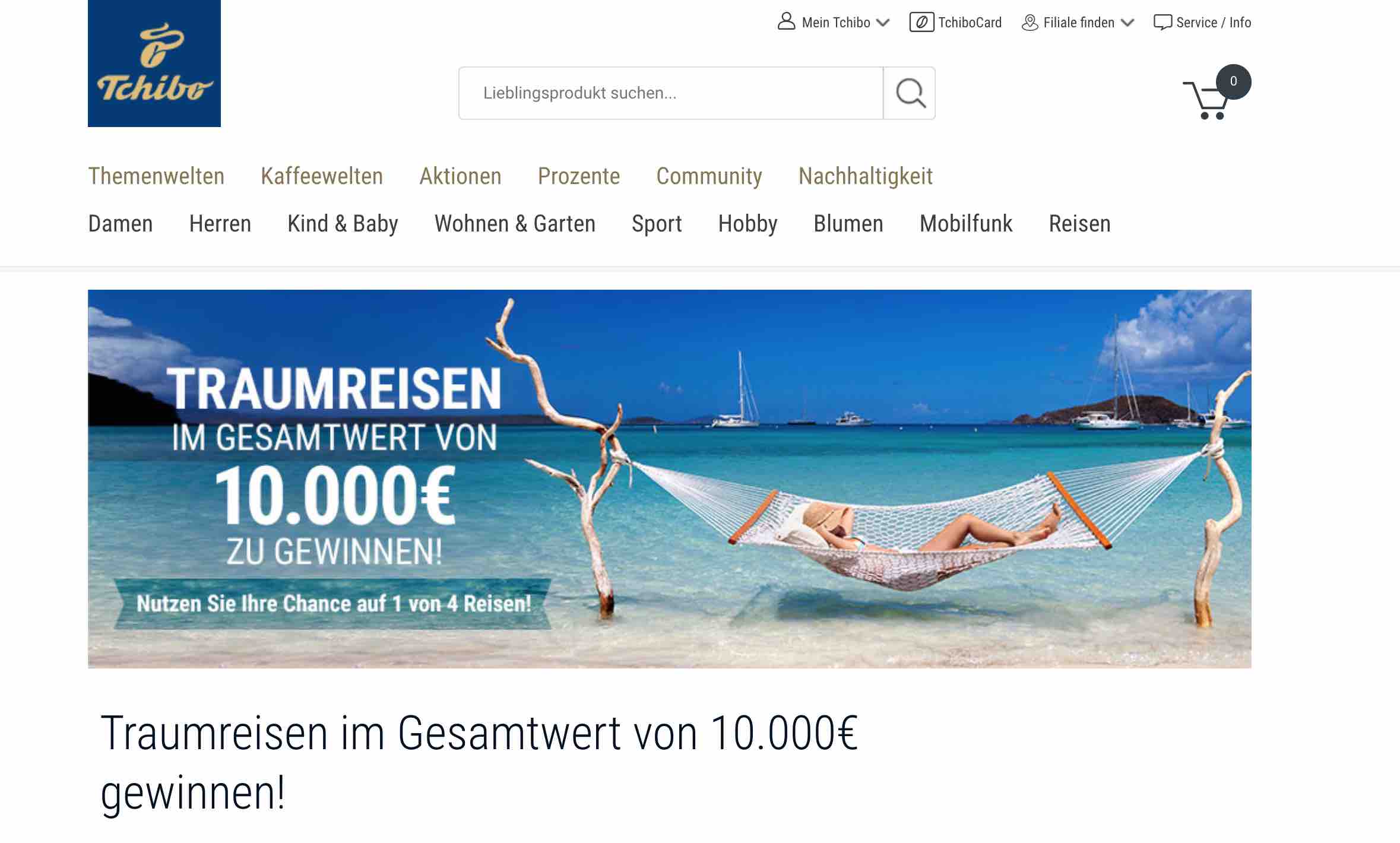 Tchibo ▶︎ Gewinn: 1 von 4 Traumreisen, Gesamtwert 10.000,- Euro Lösungsvorschlag: - Teilnahmeschluss: 03.06.2018 Link: abgelaufen