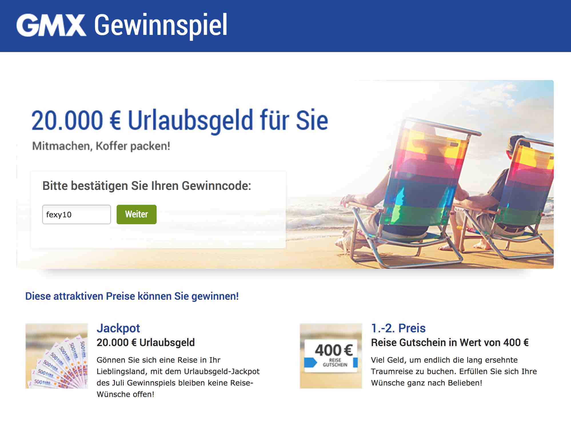 GMX.de Gewinn: 20.000,- Euro; Reisegutschein; E-Book Reader; Hotelgutschein; uvm... Lösungsvorschlag: - Teilnahmeschluss: 28.07.2018 Link: abgelaufen