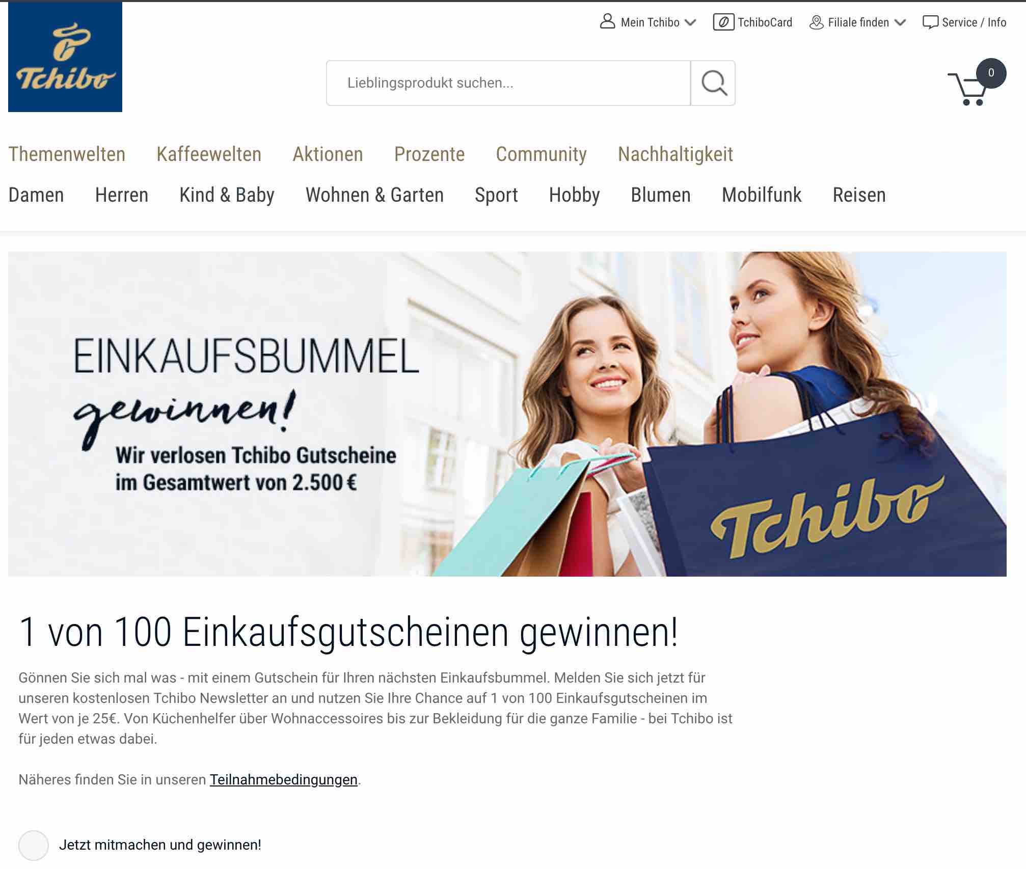 Tchibo ▶︎ Gewinn: 1 von 100 Tchibo Gutscheinen zu je 25,- € Lösungsvorschlag: - Teilnahmeschluss: 23.09.2018 Link: abgelaufen