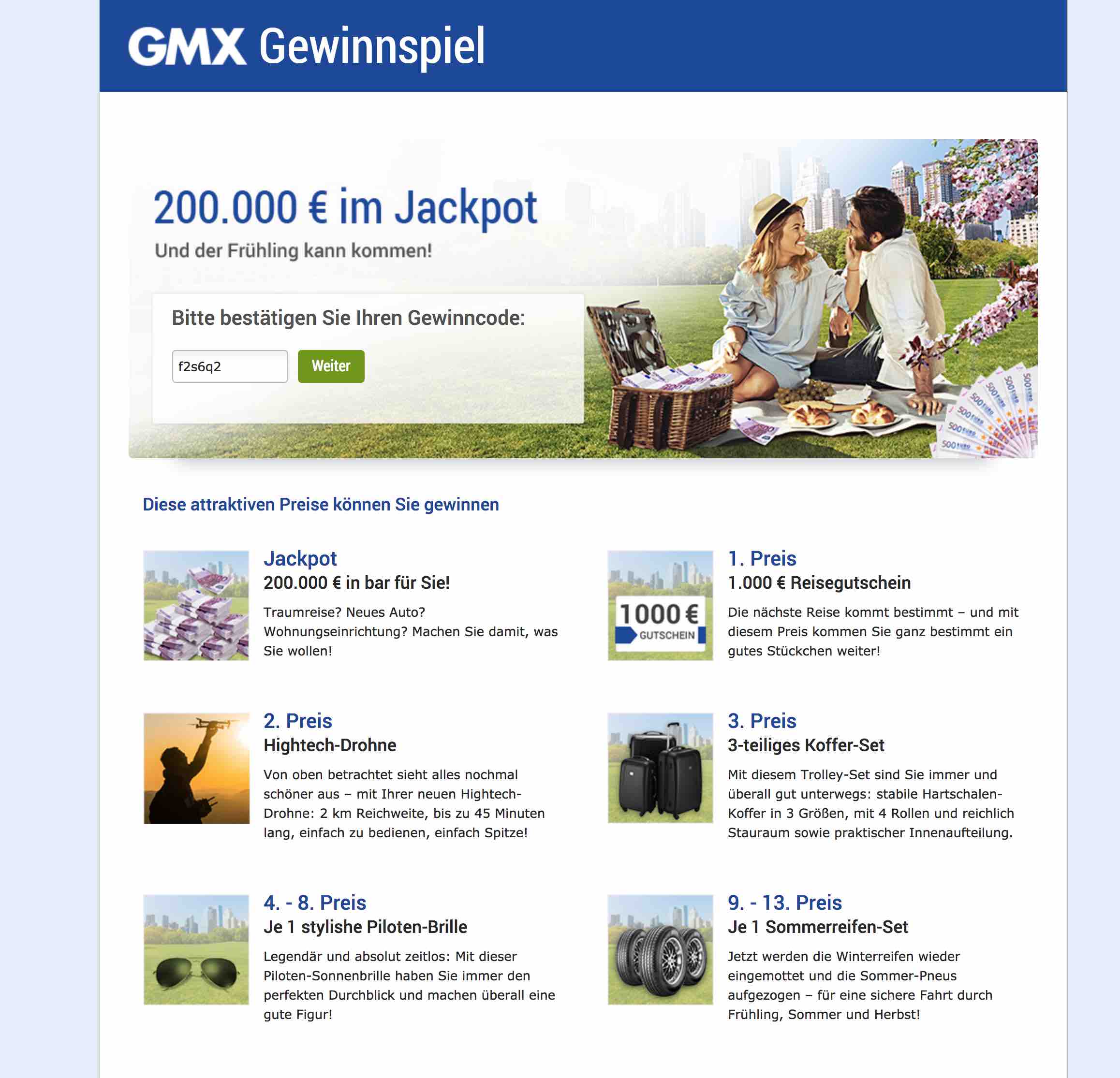 GMX.de ▶︎ Gewinn: 200.000,- € ; Drohne ; Koffer-Set ; Brille, Sommerreifen Lösungsvorschlag: - Teilnahmeschluss: 05.05.2018 Link: abgelaufen
