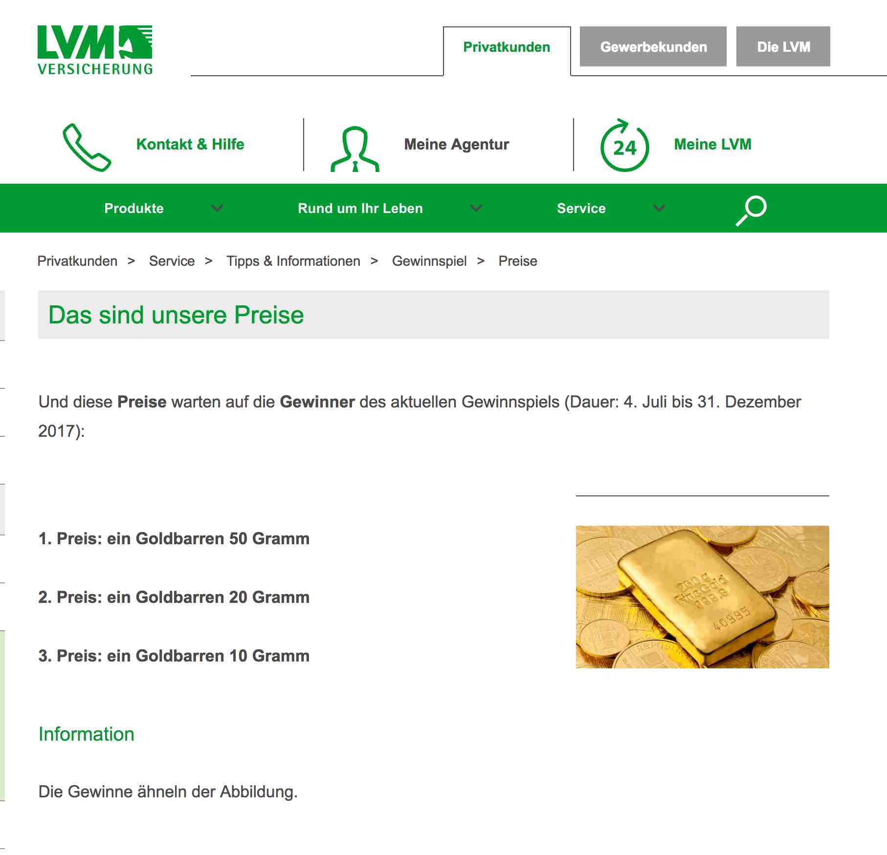 LVM Gewinn: 50g, 20g und 10g Goldbarren Lösungsvorschlag: LVM-TrendInvest Teilnahmeschluss: 30.12.2017 Link: abgelaufen