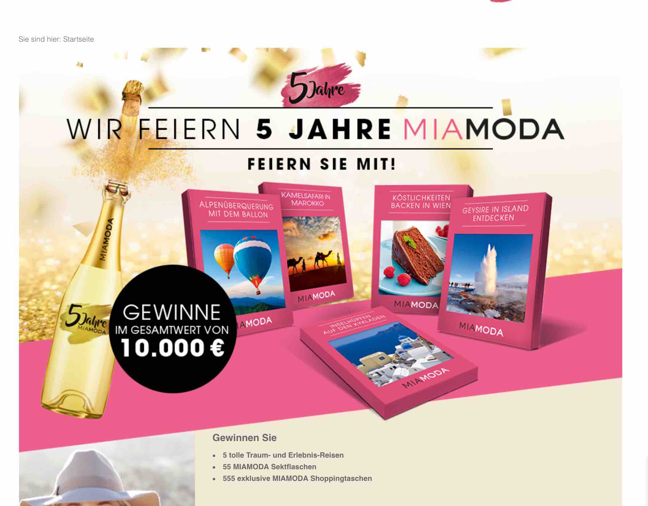 MIAMODA Gewinn: 5 Traumreisen, 55 Flaschen Sekt und 555 Shoppingtaschen Lösungsvorschlag: - Teilnahmeschluss: 30.12.2017 Link: abgelaufen
