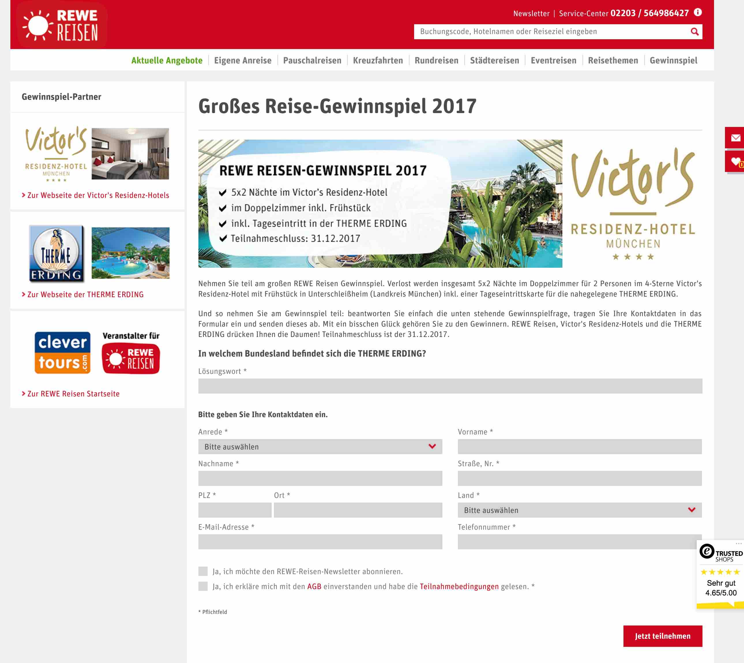 REWE Reisen Gewinn: 5x2 Nächte im Doppelzimmer für 2 Personen im 4-Sterne Victor's Residenz-Hotel Lösungsvorschlag: BAYERN Teilnahmeschluss: 30.12.2017 Link: abgelaufen