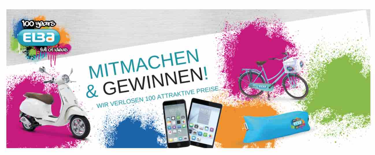 ELBA Gewinn: 1 exklusiven ELBA Vespa-Roller, 5x Iphone 7, 10x iPad Mini, 15x exklusives ELBA Holland-Fahrrad (Achtung: Es erscheint zunächst ein Pop-Up eines Newsletters) Lösungsvorschlag: 1917 Teilnahmeschluss: 14.12.2017 Link: abgelaufen