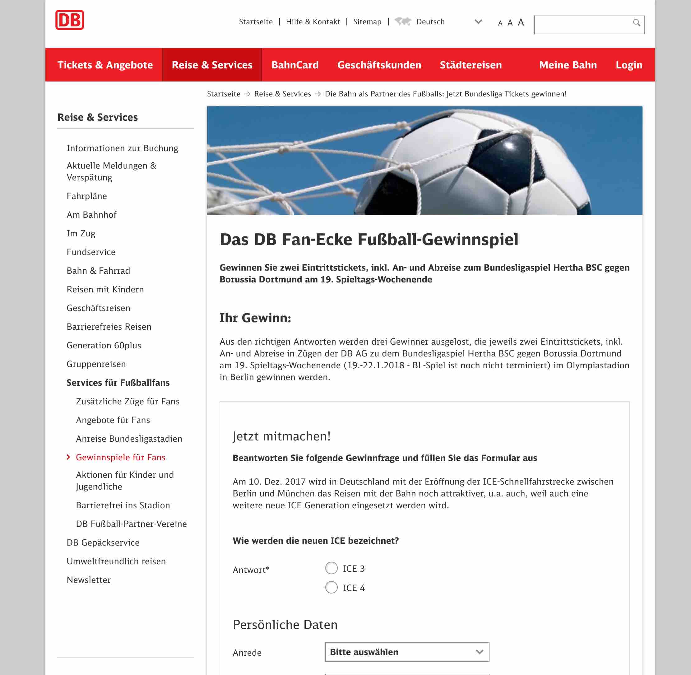 Deutsche Bahn Gewinn: 3x zwei Tickets für ein Bundesligaspiel inkl. Anreise Lösungsvorschlag: ICE 4 Teilnahmeschluss: 16.12.2017 Link: abgelaufen