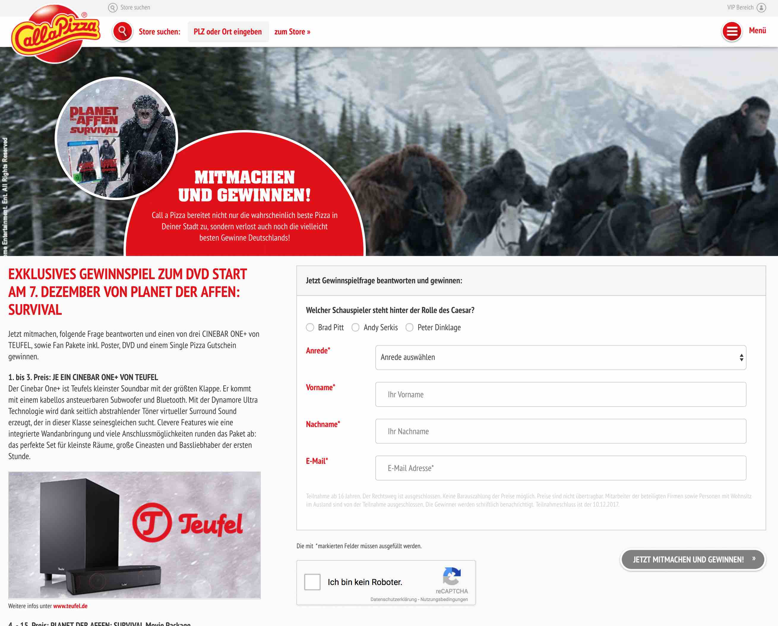 Call a Pizza Gewinn: 3x CINEBAR ONE+ von Teufel, 12x Planet der Affen: Survival Movie Package Lösungsvorschlag: Andy Serkis Teilnahmeschluss: 09.12.2017 Link: abgelaufen