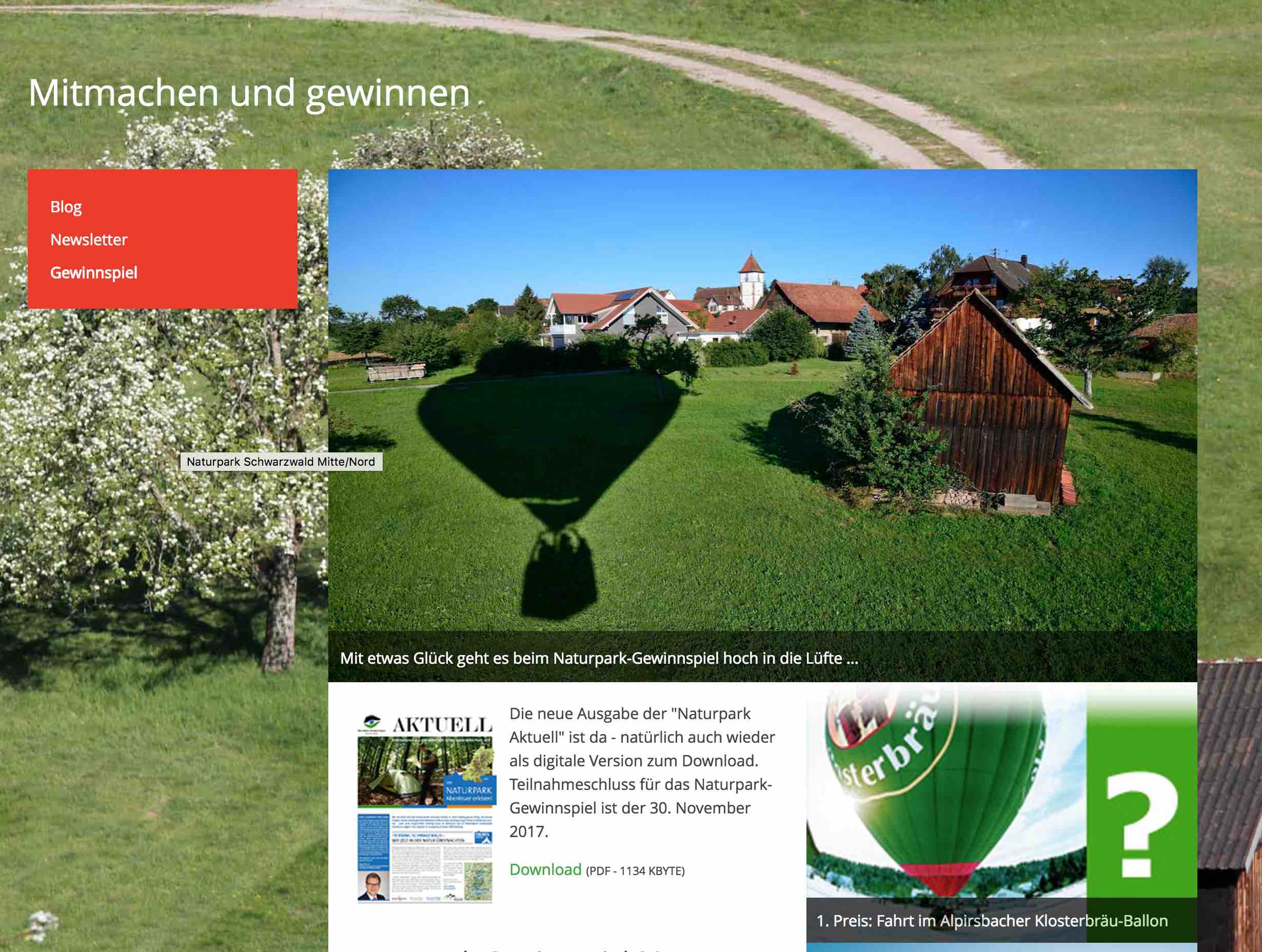 Schwarzwald Naturpark Gewinn: Ballonfahrt im "Alpirsbacher Klosterbräu"-Ballon Lösungsvorschlag: Baden-Baden, Baiersbronn und Freudenstadt- rund 70.000 Quadratmeter - Neun Teilnahmeschluss: 29.11.2017 Link: abgelaufen