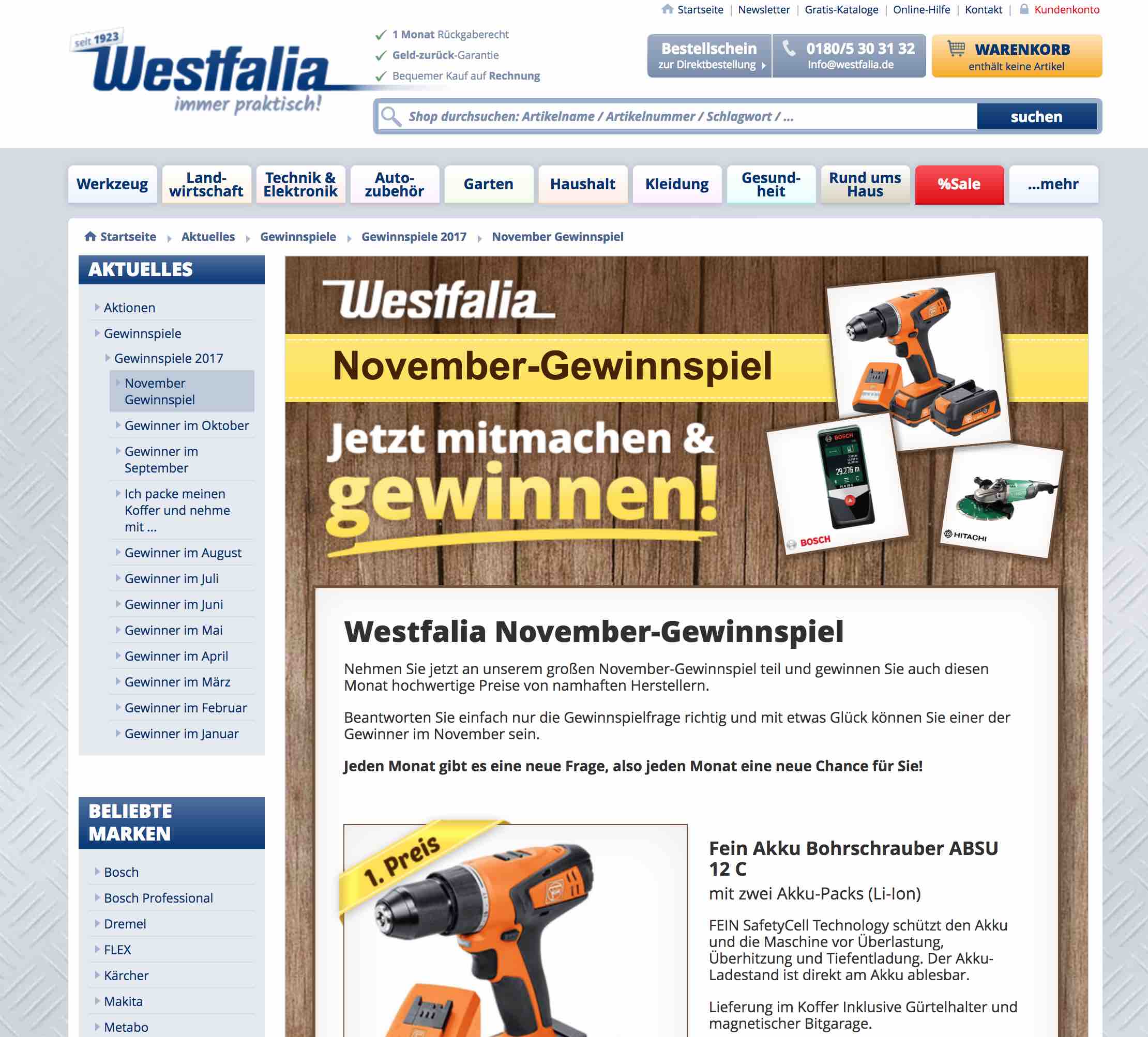 Westfalia Gewinn: Bohrmaschine; Laser-Entfernungsmesser; Winkelschleifer Lösungsvorschlag: Albert Einstein Teilnahmeschluss: 29.11.2017 Link: abgelaufen