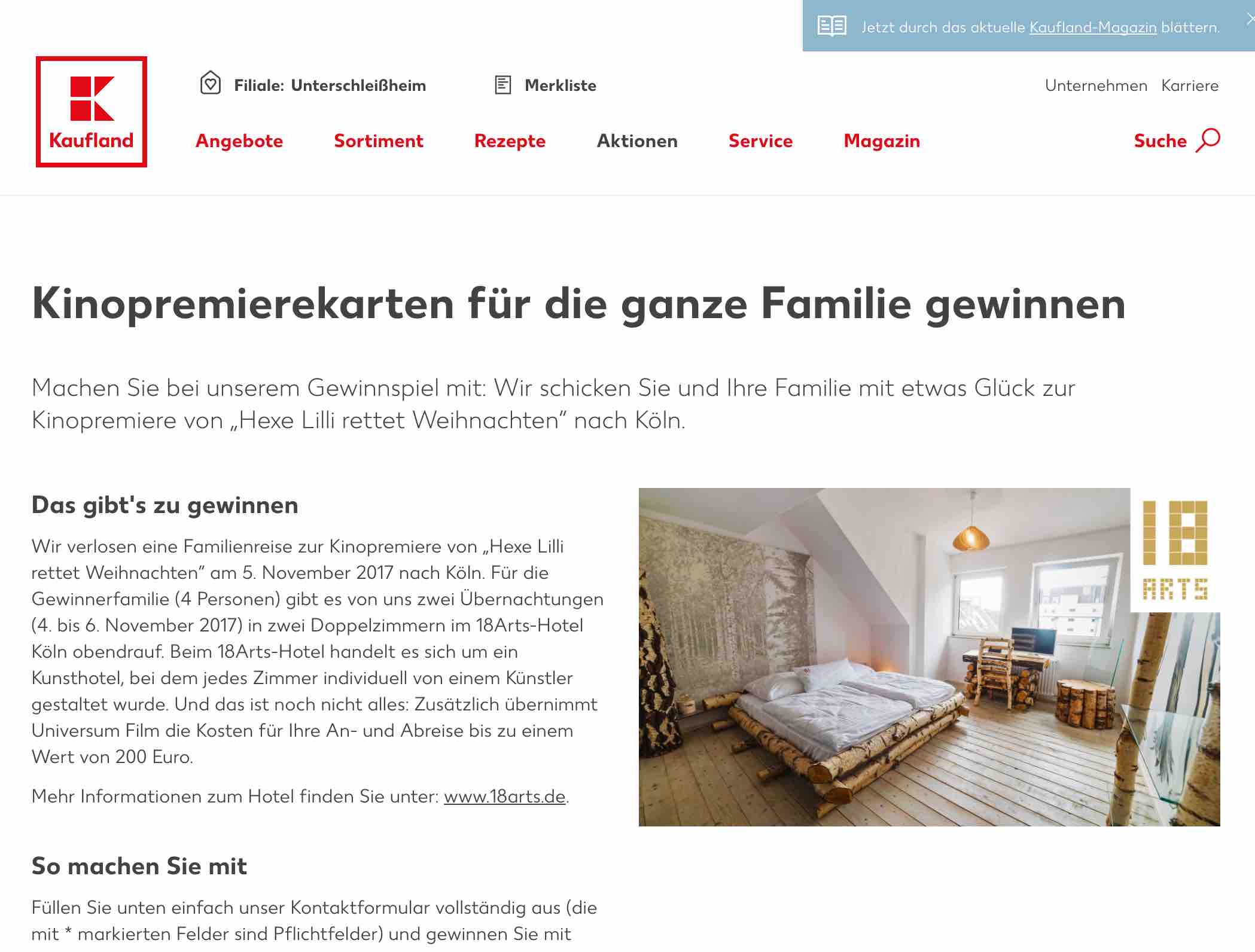 Kaufland Gewinn: Kinopremiere von „Hexe Lilli rettet Weihnachten” in Köln Lösungsvorschlag: - Teilnahmeschluss: 10.10.2017 Link: abgelaufen