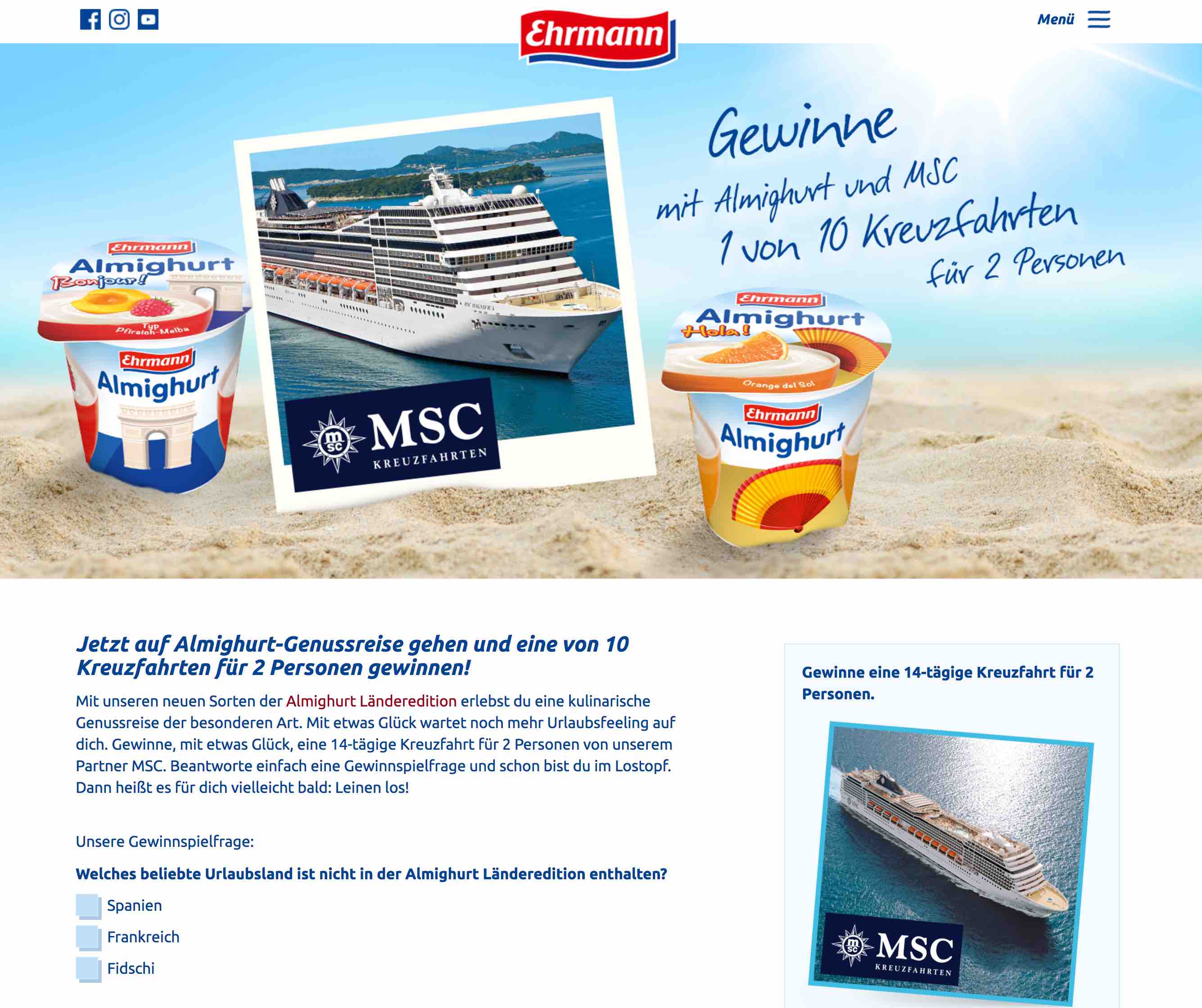 Ehrmann Gewinn: 10 Kreuzfahrten für 2 Personen Lösungsvorschlag: Fidschi Teilnahmeschluss: 29.09.2017 Link: abgelaufen