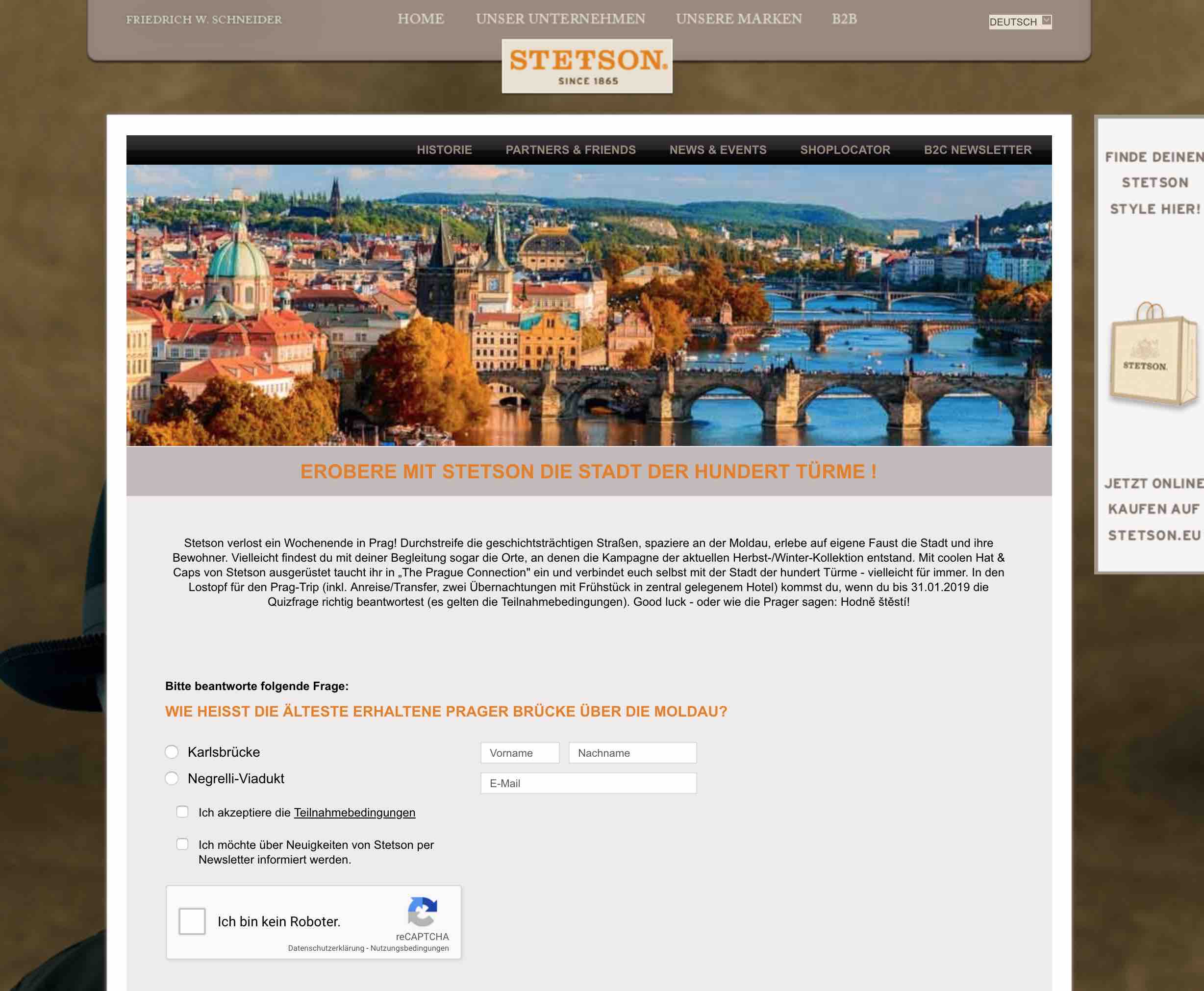 Stetson Europa ▶︎ Gewinn: Aufenthalt für 2 in Prag Lösungsvorschlag: Karlsbrücke Teilnahmeschluss: 30.01.2019 Link: abgelaufen