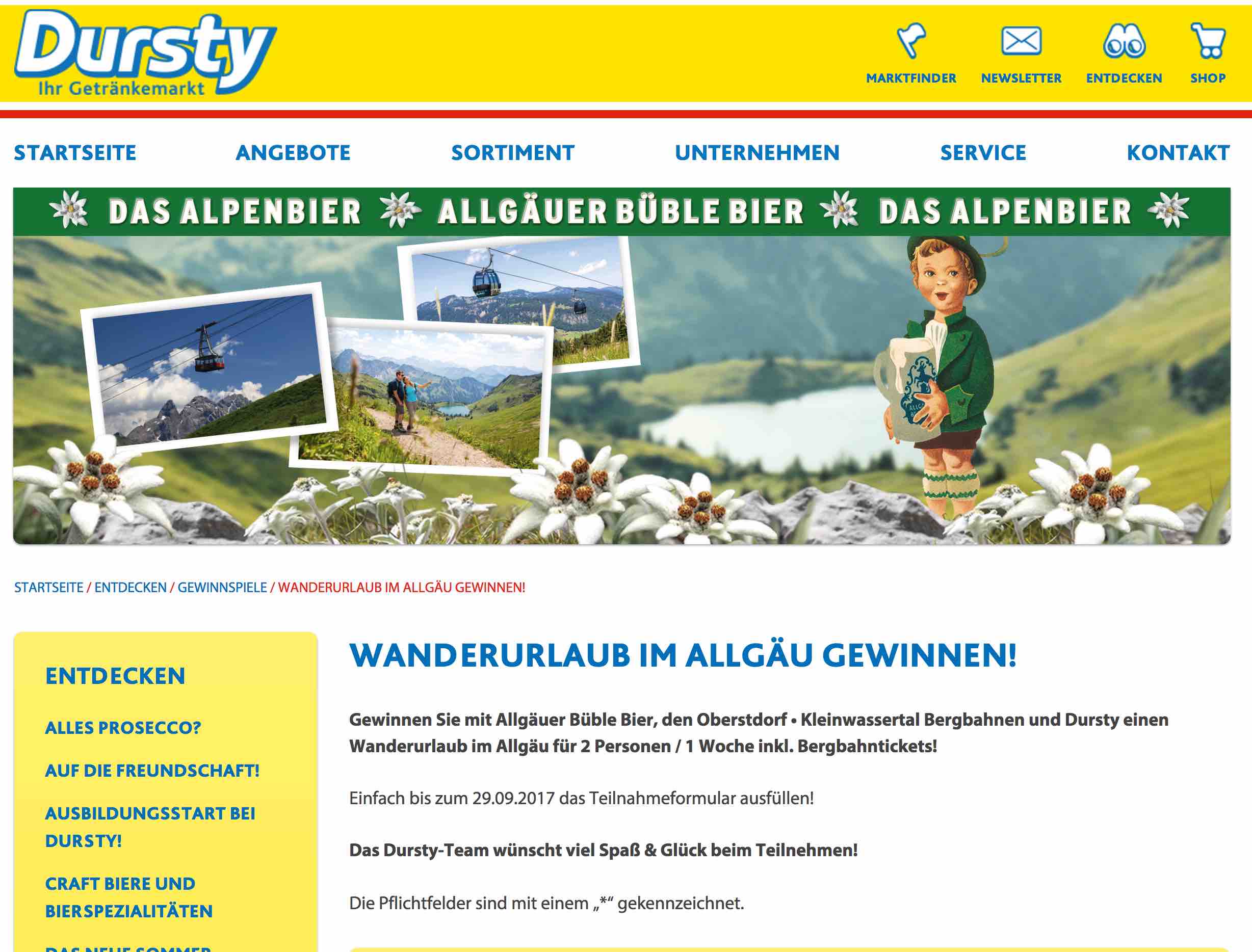 Dursty Gewinn: Wanderurlaub im Allgäu für 2 Personen / 1 Woche inkl. Bergbahntickets Lösungsvorschlag: - Teilnahmeschluss: 28.09.2017 Link: abgelaufen