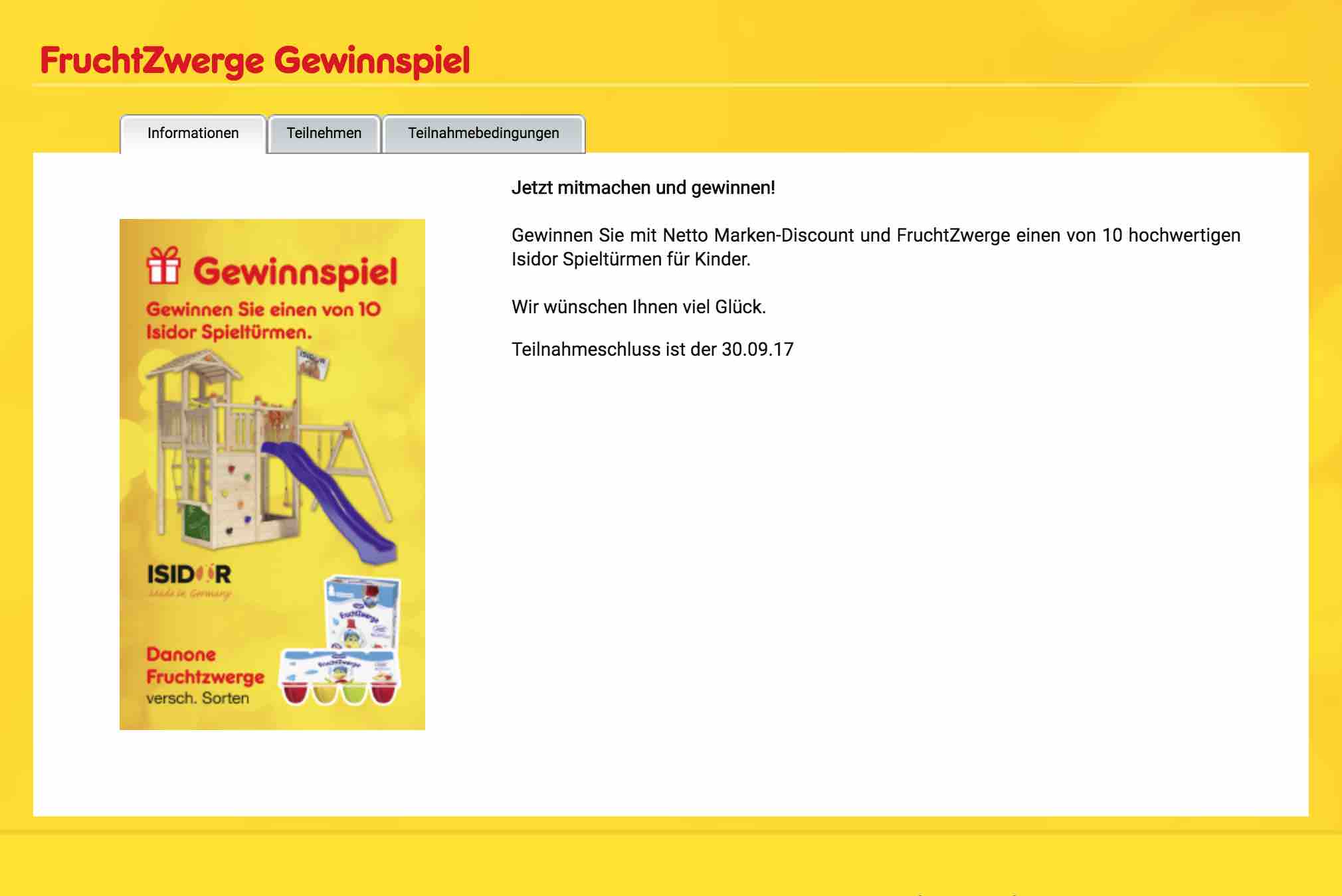 Netto Marken Discount Gewinn: 1 von 10 hochwertigen Isidor Spieltürmen Lösungsvorschlag: - Teilnahmeschluss: 29.09.2017 Link: abgelaufen