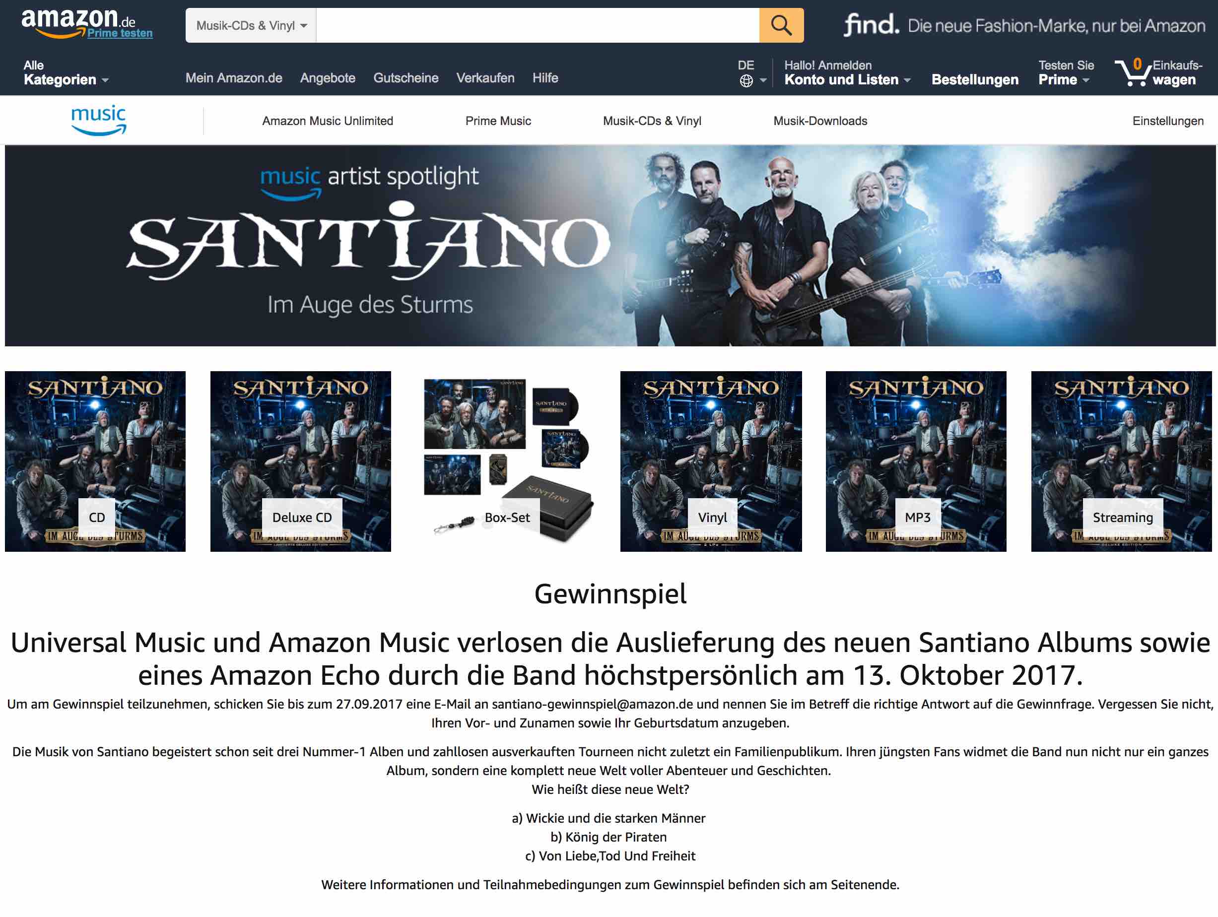 Amazon (E-Mail senden) Gewinn: Santiano Albums + Amazon Echo durch die Band höchstpersönlich Lösungsvorschlag: c) Teilnahmeschluss: 26.09.2017 Link: abgelaufen