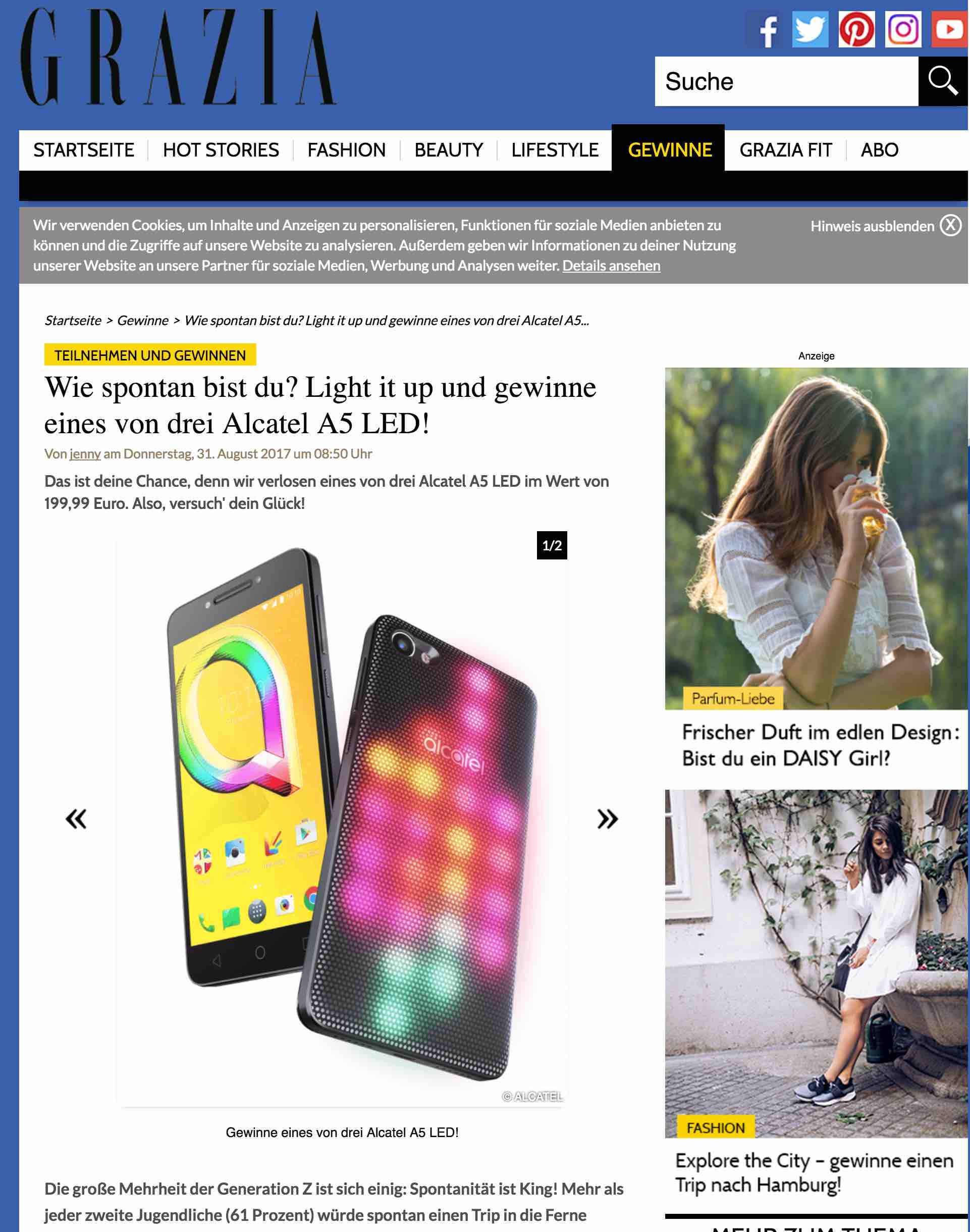 GRAZIA Gewinn: 3x ein Alcatel A5 LED Smartphone Lösungsvorschlag: - Teilnahmeschluss: 26.09.2017 Link: abgelaufen